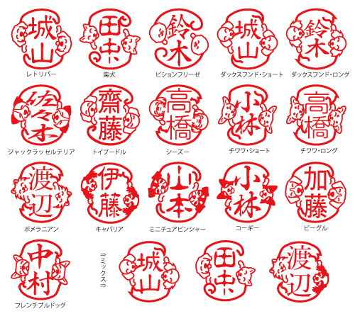 2匹の犬種は自由に組み合わせることができるため、合計256デザインの提供となる。今後リクエストなどがあれば、随時対応し増やしていく予定。価格は、浸透印タイプ(シャチハタ製、9mm丸~)が1990円から、印鑑タイプ(本柘製など、12mm丸~)が3120円から。