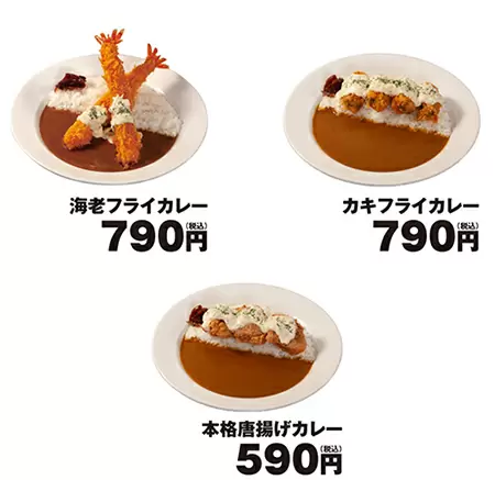価格は、海老フライカレー790円、カキフライカレー790円、本格唐揚げカレー590円。店内・テイクアウトの価格は同一。