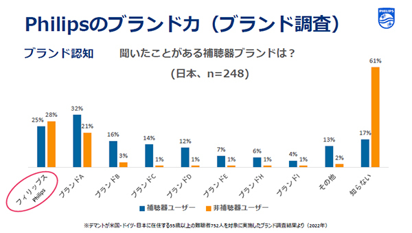 デマントが米国・ドイツ・日本に在住する55歳以上の難聴者752人を対象に実施した「聞いたことがある補聴器ブランドは?」という調査によると、際立ったのは「知らない」という回答。特に非補聴器ユーザーでは61%にものぼった。そのなかでフィリップスは補聴器ユーザー・非補聴器ユーザーともに20%を超える高い数値を記録している。
