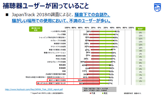 フィリップス ヒアリングソリューションズ 武田和浩セールスマネージャーは「補聴器ユーザーが困っているのは、まさにこうした状況だ」と説明する。Japan Track 2018で補聴器装用者に聞き取り状況の調査を実施したところ、「1人の相手との会話」や「テレビ視聴」では満足が不満を大きく上回った一方で、「騒がしい場所での使用」「周りがうるさい環境下で会話するとき」は不満が高い数値を示した。