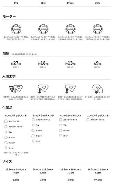 上記が注目して見たい項目を抜粋したスペック表。Proはアームが可動式でバッテリーも取り外せる。アタッチメントも最初から多く付属するので、購入すれば基本的にどのようなシチュエーションにも対応できる。しかし重量が27kgと日本人にはやや重いのがデメリット。バッテリも別売の充電クレードルを利用すれば家庭では困らないので、この時点でProは選択肢から外れた。