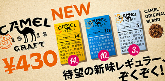 日本たばこ産業(JT)は、キャメルブランドから「キャメル・クラフト・14・ボックス」「キャメル・クラフト・10・ボックス」「キャメル・クラフト・3・ボックス」の3銘柄を10月14日より順次、全国のコンビニエンスストア及びたばこ販売店などで発売する。価格は430円。