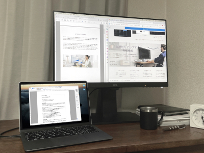 文章を書くことが多い筆者の場合、ノートPCの画面にはWordなどのテキストエディタを、外部モニターにはWebブラウザやPDFなどを表示。テキストエディタのウィンドウと、資料や誌面レイアウトの閲覧に使うウィンドウとが干渉されず、効率よく文章を作成できる環境だった。ノートPCの画面が小さくても、Wordなどのアプリを一つだけ開くなら十分なサイズで、逆に大画面のモニターではPDFやWebを複数並べて表示しておけるので、必要な情報を探しやすい。