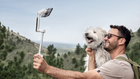 本体には、215mmまで伸びるエクステンションロッドを備えており、自撮り棒としても使えるほか、三脚をハンドルから伸ばして、自分自身の撮影や、モーションタイムラプスや360°写真といったクリエイティブな撮影もできる。また、コールドシューを搭載しているので、オーディオ用マイクの接続にも対応している。
