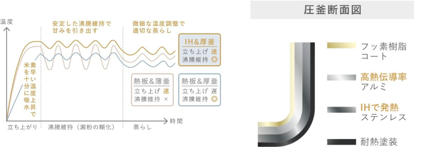 素早い温度上昇と安定した沸騰状態の維持が得意なIHを採用し、米本来の甘みを引き出す。IH加熱を支える専用のクラッド厚釜は、フッ素樹脂コート、高熱伝導率のアルミ、ステンレス、耐熱塗装の4層構造を採用し、少量でも美味しく炊飯することができる。