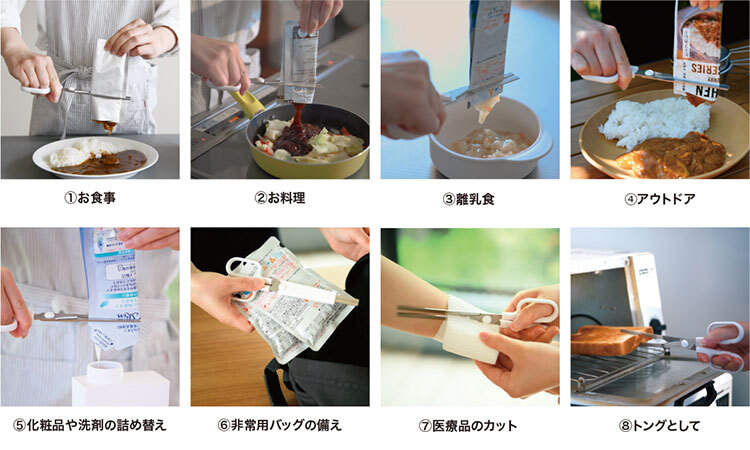 そこでヤクセルは、これらの悩みをすべて解消するべく、レトルト食品専用ハサミの「れとらくはさみ」を開発した。多機能でありながら、シンプルな構造で洗いやすく、コンパクトで持ち運びや収納も簡単にできるので、キャンプなどのアウトドアや旅行にも役立つ。また、非常用バッグに入れておくと、非常食や医療品の開封に使用できる。