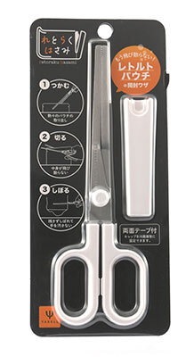 「れとらくはさみ」は、1本で「つかむ・きる・しぼる」の3つの機能を持ち合わせた、レトルト食品用の多機能ハサミ。手軽さが魅力のレトルト食品だが、その一方でパウチを扱うときには、(1)パウチをつかむときに「熱くて危険」、(2)パウチを切るときに「中身が飛び散る」、(3)パウチの「中身が完全にしぼり出せない」--という3つの悩みがあった。