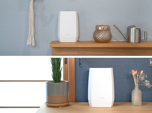 手のひらサイズのコンパクトなデザインで、目に見える所に置いても圧迫感の少ない白色を採用した。雑然となってしまいがちなケーブルは、背面に格納スペースを設けているので、すっきりと収めることができる。Wi-Fiに限らず、電波は障害物があると届きにくくなるため、より効果的にWi-Fiを届けられるよう、自宅の中心など見通しの良い場所に違和感なく置けるデザインを採用した。