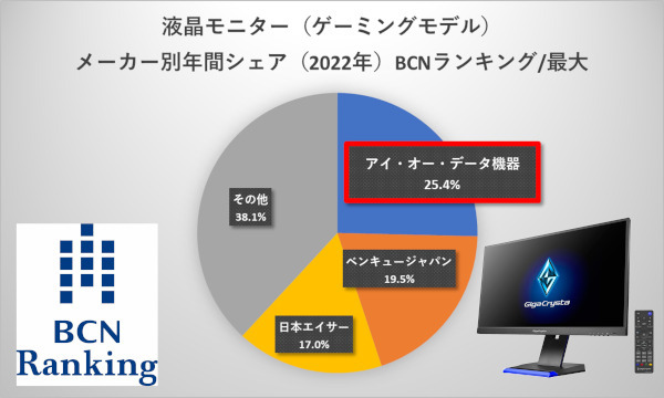 全国約2,300の家電量販店やネットショップの実売データを集計するBCNランキングによると、アイ・オー・データ機器は、2022年1月~12月の1年間で最も多くゲーミングモデルの液晶モニターを購入されたメーカー。年間のメーカーシェアは25.4%と、4人に1人が同社の製品を選んでいる計算です。近年は、eスポーツ大会やイベントに採用されるなど、ユーザーからあつい信頼を寄せられています。そんなアイ・オー・データ機器が発売した360Hzの液晶モニターがどのような実力なのか、さっそくチェックしていきましょう。