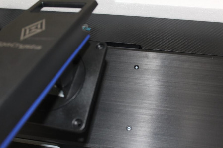 背面は、左上の「GigaCrysta」のロゴはLEDで光り輝いています。メニューで光のパターンや色の変更が可能。もちろんオフにもできます。支柱にはケーブルを通す穴が空いているので、複数のケーブルをすっきりとまとめられます。あと、標準で付属しているケーブルがすべて青色でポイントになっていますね! ほかの機器のケーブルと混ざる心配がないので、配線の整理に便利です。