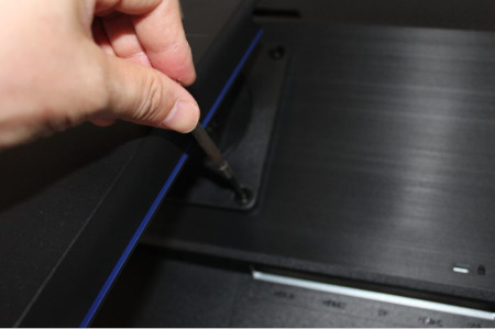 組み立てには、ドライバーが必要です。まず本体を平置きした状態で、添付のネジで支柱を固定します。