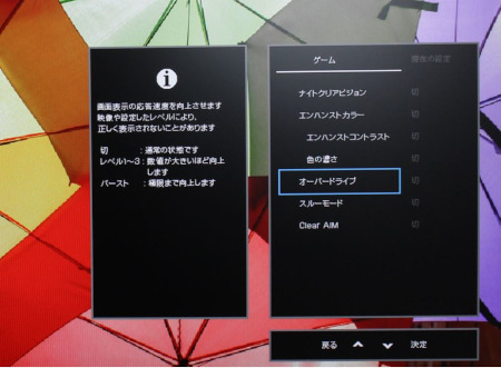 オーバードライブは、応答速度を向上させる機能です。360Hz/オーバードライブレベル3設定時/Clear AIMレベル3に設定すると、応答速度の最大値「0.2ms」を実現できます。