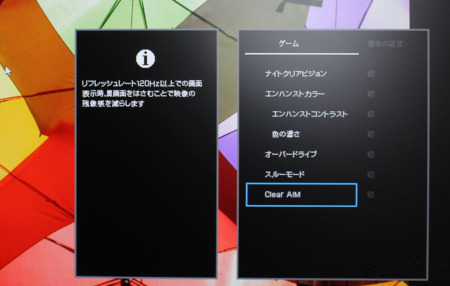 Clear AIMは、リフレッシュレートが120Hz以上のときにフレームとフレームの間に真っ黒なフレームを挟み込んで残像感を低減します。いわゆる黒挿入機能ですね。動きが激しい場面でもブレが少なくなるので、FPSなどで活用すると敵の動きの視認性がアップします。