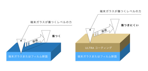 機種のガラス面や保護ガラス・フィルム(アクセサリー)の表面には、様々な外的要因によって目に見えにくい小さなキズが付きやすくなっている。これらの傷に汚れが入り込むことで、表面に汚れがたまることがある。「ULTRAコーティング」は、強固なガラス被膜を形成することで、表面のキズや擦れを抑え、キズの凹凸に入り込む汚れの付着を軽減する。コーティングを施すことで、美しい状態を維持することができる。