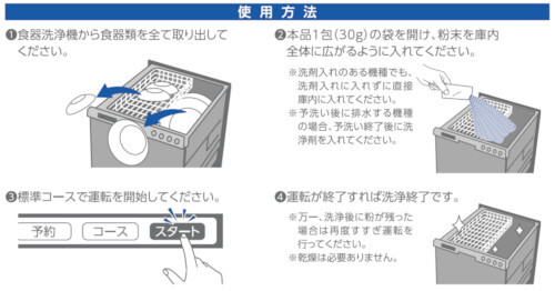使用にあたっては、庫内から食器類をすべて取り出し、洗浄剤1包を庫内の洗剤ケースに入れ、ドアを閉めて運転を行うことで運転終了とともに洗浄も終了となる。