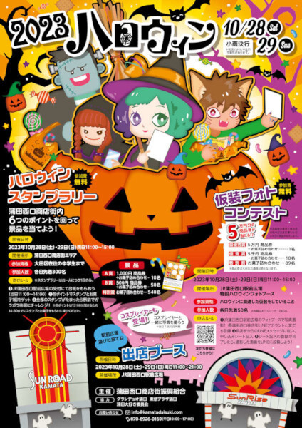 期間中は、スタンプをためてお菓子がもらえる「ハロウィン スタンプラリー」や、最優秀賞に大田区内共通商品券5万円が贈られる「仮装フォトコンテスト」が行われる。また、JR蒲田西口駅前広場では出店ブースが登場する(両日11~21時)。