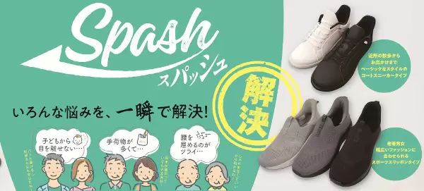 「RESTORATION Spash」は、立ったまま靴べらや手を使うことなく、一瞬で履けるシューズ。腰を屈めるのがつらいときや、訪問先での靴の脱ぎ履き、荷物を持っていて両手がふさがっているときなどでも、簡単に脱ぎ履きが可能となっている。