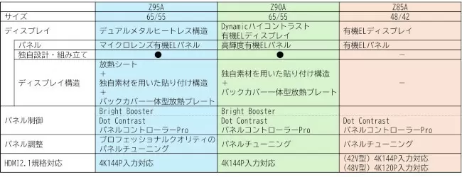 ここで新製品のラインアップを紹介しておこう。有機ELテレビは3シリーズ、6モデル。フラグシップはZ95Aで、65V型のTV-65Z95Aと55V型のTV-55Z95A。ハイグレードと位置づけられているのはZ90Aで65V型のTV-65Z90Aと55V型のTV-55Z90A。中型のポジションがZ85Aで48V型のTV-48Z85Aと42V型のTV-42Z85Aだ。発売日はZ95AとZ90Aがともに6月21日で、Z85Aが7月19日。市場想定価格はZ95AのTV-65Z95Aが52万円前後で、TV-55Z95Aが37万円前後。Z90AはTV-65Z90Aが40万円前後、TV-55Z90Aは29万円前後だ。Z85AはTV-48Z85Aが23万円前後で、TV-42Z85Aが22万円前後となっている。