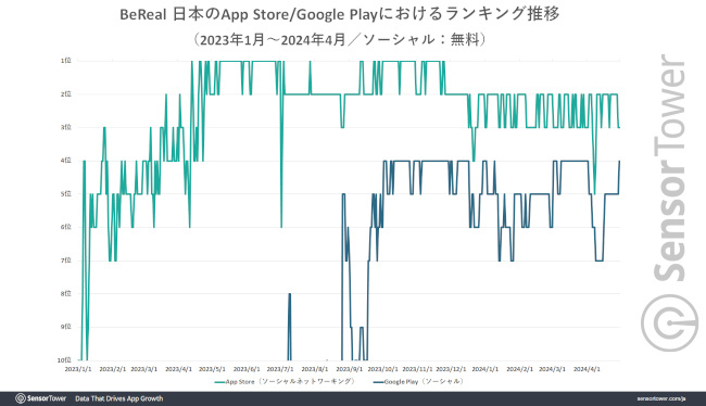ランキングでもその傾向が確認できる。Sensor Towerのデータによると、日本のApp StoreとGoogle Playのソーシャルネットワーキングジャンルの無料ダウンロードランキングで、2023年以降トップ10の常連になっている。