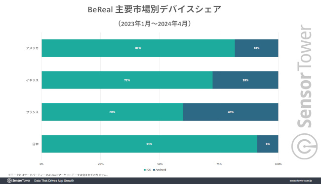 Sensor Towerのデータによると、「BeReal」主要市場別プラットフォームシェアでは、日本はiOSのシェアが圧倒的で90%を超えている。いずれの市場でもiOSのシェアが高いものの、日本はそれが際立っている。