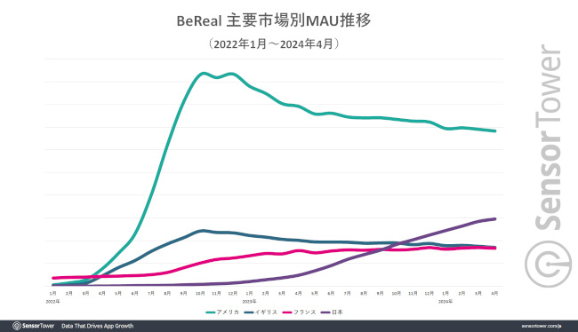 Sensor Towerは、写真共有SNSアプリ「BeReal」の日本MAUが2023年から1年で10倍以上に成長し、今年4月には世界2位に浮上したことを発表した。