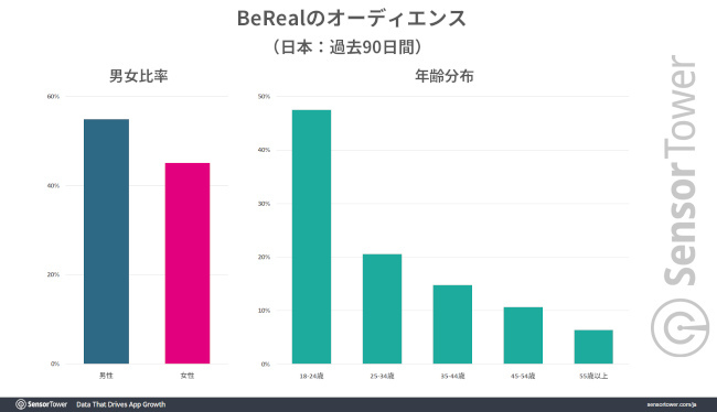 日本ではZ世代に人気といわれる「BeReal」だが、これを裏付けるデータもある。Sensor TowerのAudience Insightsのデータによると、過去90日間の日本のユーザー分布では18~24歳の層が全体の50%近くを占め、トップとなっている。