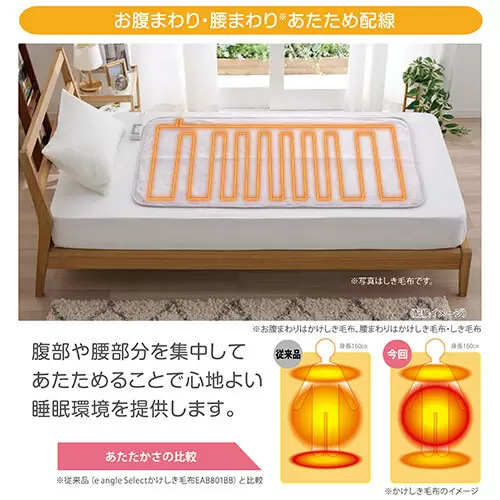 電気かけしき毛布「ANGEBH80APG」、電気しき毛布「ANGEBL55APG」ともに、業界初となる「お腹まわり・腰まわりあたため配線」を採用しており、腹部や腰部にあたる部分にヒーター線を多く配置することで、心地よい睡眠環境を提供する。