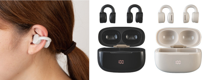 まず、最も特徴的な製品が「オープンイヤーワイヤレスイヤホン BTE-OWS01」だ。同製品は、最近高まりを見せているイヤーカフ型のオープンイヤーワイヤレスイヤホン。構造的に耳をふさがないため、外音が聴こえることが特徴で、さまざまな作業と一緒に音楽を聴く「ながら聴き」に適した製品といえる。イヤーカフ型の空気伝導方式を採用しているため、締め付けや振動といった不快感も少ない。