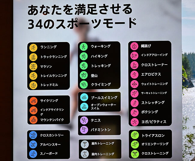 搭載するスポーツモードは全34種類。ランニングに特化しているだけあって、トラックランニングやマラソンなど、5種類のランニング競技に対応。自身の目標ペースを設定し、ガイドするゴーストランナー機能を備えており、レースのシミュレーションや継続的なパフォーマンス分析が可能だ。ランニング以外では、バドミントンやヨガ、筋力トレーニングなどにも対応している。