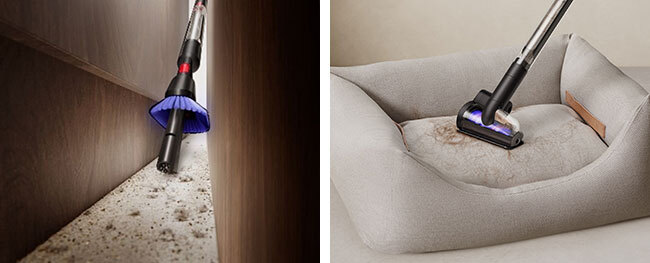 「Dyson PencilVac Fluffycones」「Dyson PencilVac Fluffy」ともに、日本の住環境や掃除習慣の研究・観察に基づいて開発された、世界でもっともスリムな設計のコードレス掃除機で、ダイソン史上もっともスムーズに動いて、スリムな形状によって狭い場所にも自在にアクセスできる。本体を床に対してフラットに寝かせられ、高さ95mmの隙間にも入り込めるため、低い家具の下の掃除も可能になる。スリムな本体への収納が可能な直径28mmという極小サイズながら、パワフルな吸引力を生み出す高速モーターとして開発された、同社の掃除機において史上最小かつ最速の「Dyson Hyperdymium140k モーター」を搭載することで、毎分最大14万回転の高速回転が強力な吸引力を生み出す。