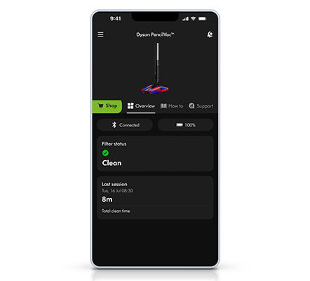 「Dyson PencilVac」は、ダイソンの掃除機史上初となる、「MyDyson」アプリとの接続が可能なコードレス掃除機で、「MyDyson」アプリを通じて運転モードの設定や、メンテナンス時期および方法の確認などができる。また、本体には液晶ディスプレーを搭載し、選択中の運転モードと残り時間が、掃除中に表示される。