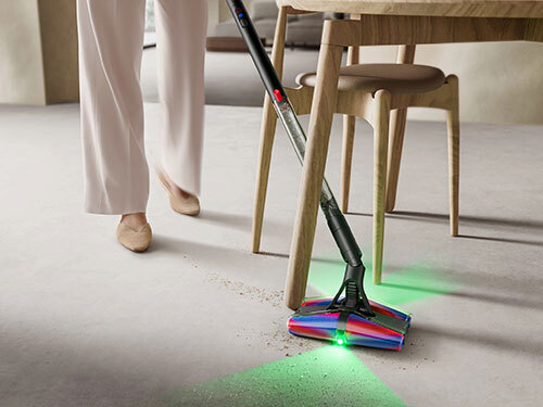 そのほか、ヘッドの前方と後方からそれぞれレーザーのような光が照射され、肉眼では見えにくいホコリを浮かび上がらせて、掃除済みのエリアを確認できる。