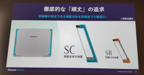 「SC」は、多様な環境で活躍するモバイルワーカーの頼れるパートナーとして、パナソニック コネクトが長年にわたって培ってきた技術とノウハウを結集させて、「レッツノート」史上最高レベルの「頑丈」、洗練されたシンプルな構造による「軽量」と「長時間」を、一切の妥協なく研ぎ澄ましている。特に「頑丈」では、狭額縁の側面全体を保護できるように、側面方向のリブに新構造を採用。大幅に強化した。従来は四隅のみの保護で、側面方向は弱点だった。