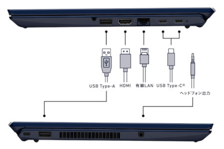 インターフェースは、右側にUSB Type-C×2基、左右にUSB Type-Aを一つずつ備えるほか、HDMI出力、有線LANポートといった利用頻度の高いインターフェースをひと通り搭載する。また、ACアダプターは重さ約185gと軽量で、持ち運びしやすいUSB Type-C標準ACアダプターへと変更された。