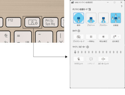 本体のマイクは3基に増えたほか、AIノイズキャンセリング機能が進化し、会議のシチュエーションに合わせて選べる四つのモード(標準モード、プライベートモード、プライバシーモード、会議室モード)を備えている。合わせて「VAIOオンライン会話設定」も搭載しており、専用キーで呼び出してワンアクションで各種設定を切り換えられる。