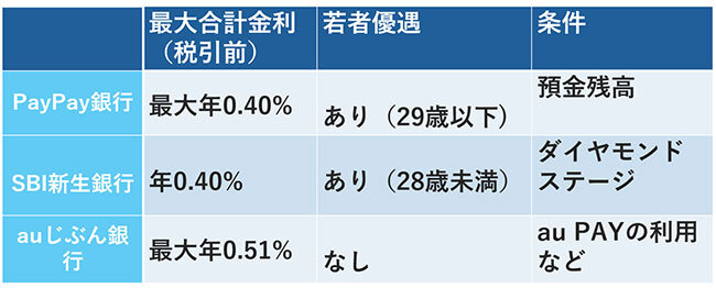 大手都市銀行・地方銀行などの銀行預金はかつて横並びの低金利でしたが、市場金利の変動を受け、2025年3月上旬には都市銀行でも年0.2%(税引前)まで上がりました。5月の時点で、インターネット銀行(ネット銀行)だと条件付きでさらに高金利です。