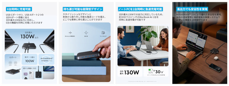 「Anker Nano Charger(130W, 6 Ports)」は、USB Type-C×4基、USB Type-A×2基を搭載し、計6台の機器を同時に充電できるUSB充電器。合計出力は最大130W、単一のポートでは最大100Wの出力が可能なので、MacBook Proの充電に対応するほか、MacBook Air、iPhone 16、AirPodsなどを3台同時に充電できる。GaNの採用によって、本体の小型化および放熱性の向上が可能になり、コンパクトかつ超薄型デザインを実現した。さらに、電源コード(長さ1.5m)は取り外せるので持ち運びしやすい。