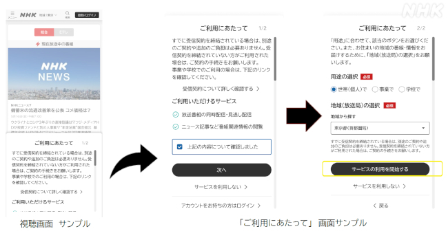 10月1日以降、「NHK ONE」にアクセスすると「ご利用にあたって」という画面が表示され、サービスの利用にあたって受信契約が必要であることが告知される。この画面にて、「サービスの利用を開始する」ボタンを押すことで、直ちに「NHK ONE」の利用手続きを始められる。