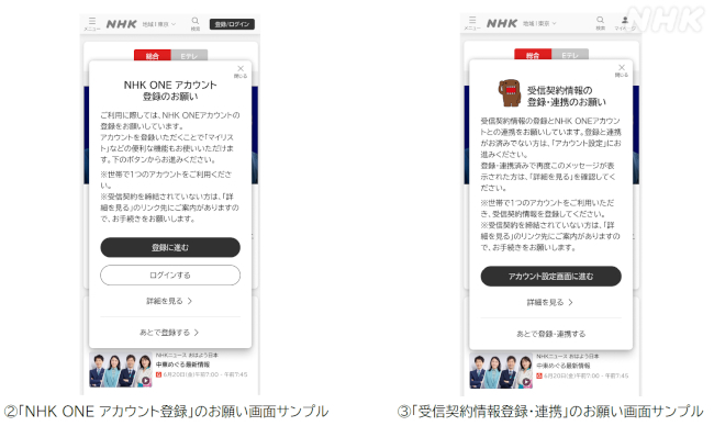 続けて、インターネット上で受信契約を確認するために、受信契約情報の登録と「NHK ONE アカウント」の連携を行う。その後、NHKによる契約照合を経て設定が完了し、「NHK ONE」が利用可能になる。