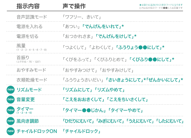 ハンズフリー操作は、従来の電源のON/OFF・風量の調節・首振り運転・モード選択などから、 「リズムモード」「音量変更」「タイマー」「風向き調整」「チャイルドロックON」が新たに増えた。音声認識できる指示ワードも10種類から39種類に増加した。