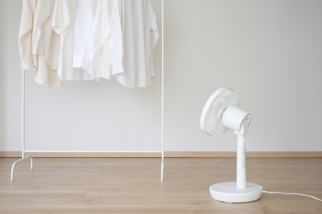 「衣類乾燥」モードでは、強風運転と上下左右自動首振りで、部屋干しに最適な自動運転を行う。洗濯物の下から風を送ることで、部屋干しの衣類を効率よく乾かすことができる。