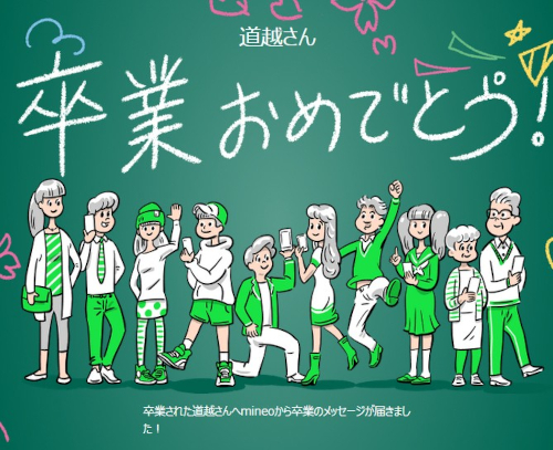 諸事情により、残念ながら今回退会することになったわけだが、「出戻り」も十分考えられる。卒業証書に現れているように、他に例がない、ユーザーサイドに立ったサービスがとても気に入っていた。しかもそれとなくおしゃれだ。単なる一人の通信インフラユーザーではなく、壮大な社会実験の参加者であるかのような楽しさもあった。次の乗り換えにあたって、競合他社と条件が同じなら、迷わずmineoを選ぶだろう。多少条件が劣っているぐらいでも、目をつぶってmineoを選ぶはずだ。利用している時からそうだったが、サービスとは何か、差異化とは何かを気付かせてくれる存在がmineoだった。ありがとう。また会おう。(BCN・道越一郎)