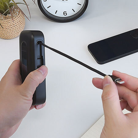 新製品は、巻き取り式のUSB Type-Cケーブルが一体となったモバイルバッテリー。ケーブル長は約55cm。容量は1万mAhとなっており、ケーブルを持ち歩かず充電できるのが特徴だ。付属の巻き取り式ケーブルと、USB Type-Cポートを同時に組み合わせれば、一度で二つまでの機器を充電できる。