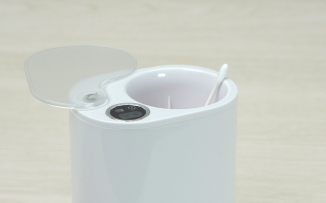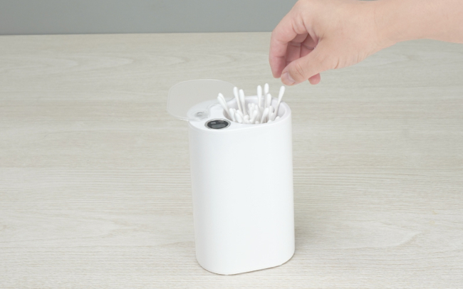新製品は、手をかざすとふたが自動開閉し、綿棒を取り出しやすくなる電動綿棒ケース。綿棒はそのままだとケースから取り出しにくい、余分に取れてしまうなど、意外と手間がかかることが多い。メイク中のベトベトした手で取るのに抵抗を感じるといった声もある。