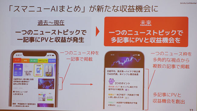 提携メディアの収益面では、スマニューAIまとめの出典として採用した記事に対して、広告収入が各社に分配される仕組み。読者が記事のテーマについて深掘りや背景を知ろうとすればするほど、提携メディアのPVと収益機会が増すという。(BCN・細田 立圭志)