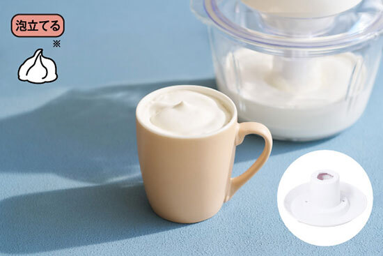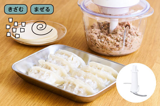 新製品は「きざむ・まぜる・おろす・泡立てる・砕く」の五つの機能を搭載したフードプロセッサー。肉のミンチや野菜のみじん切り、大根おろし、ホイップクリームなどがこれ一台で簡単に作ることができる。また、氷も砕けるハイパワー仕様で、かき氷やクラッシュアイスもできる。