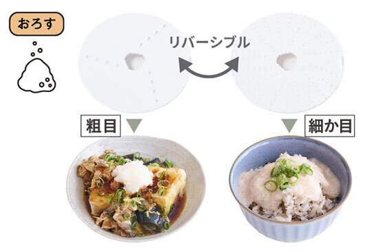 なお、食材をおろす際には、両面おろし刃で、粗さを調節することが可能。通常の大根おろしから、ザクザク食感の鬼おろし、長芋のとろろなど、幅広く対応する。