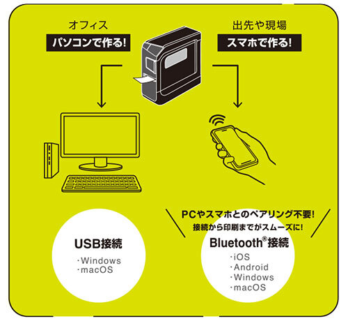 PCとスマートフォンどちらでもラベル作成ができ、PCではWindows向けラベルソフト「テプラ クリエイター」、macOS向けアプリ「TEPRA LINK2」にも対応。大量印刷や連番ラベルの作成なども容易だ。スマホではiOS/Android向けアプリ「TEPRA LINK2」を使えば、家庭や小規模オフィスでも手軽にラベルの作成・編集ができる。