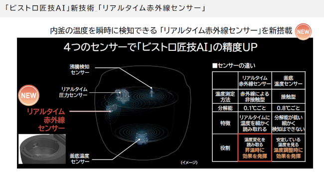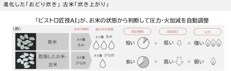 この四つのセンサーで米の含水率や吸水スピード、釜内の水分量・温度などを把握する。実に、約9600通りの中から最適な火加減や圧力加減を調節する。四つのセンサーで米の状態を見極めながら炊き方をコントロールする機能を「ビストロ匠技 AI」と呼ぶ。