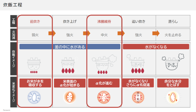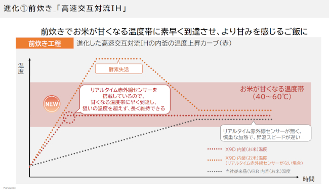 特に、リアルタイム赤外線センサーが威力を発揮するのは、炊飯工程の「前炊き」と「沸騰維持」。米が水を吸収する前炊き時の重要なポイントは、米が甘くなる40~60℃の温度帯にいかに素早く到達させるかにある。ただ、急速に加熱しすぎて60℃を超えてしまうと、逆においしさを損う「酵素失活」という現象を起こしてしまう。